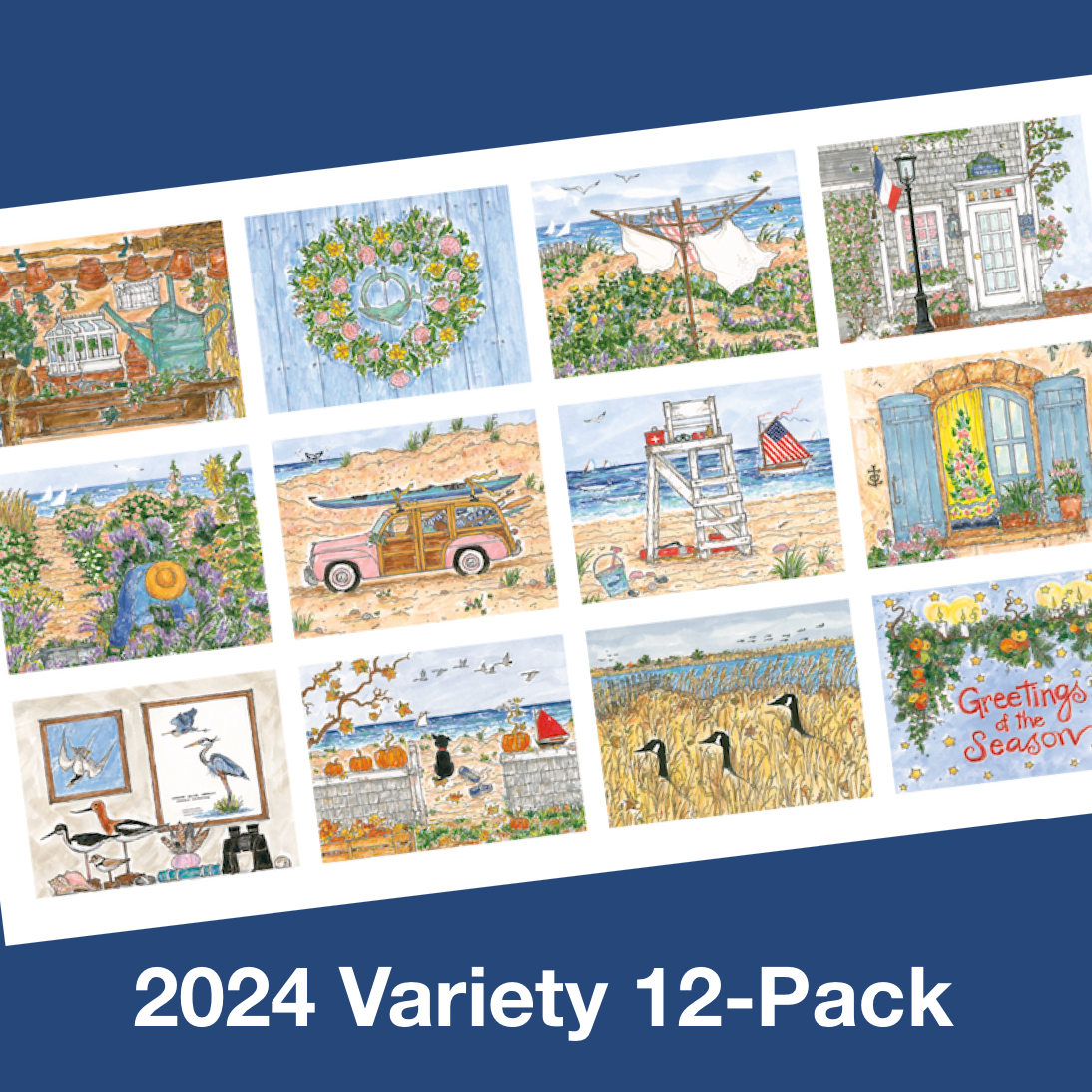 This is a VARIETY pack of one of each of the images as shown from the 12 MONTHS of the 2024 Calendar Collection on 4"x5" invitation size postcards which comes with the standard A2 invitation size white envelopes. These invitation size postcards can be used with envelopes, as a postcard, a gift card or simply display anywhere to raise a smile.